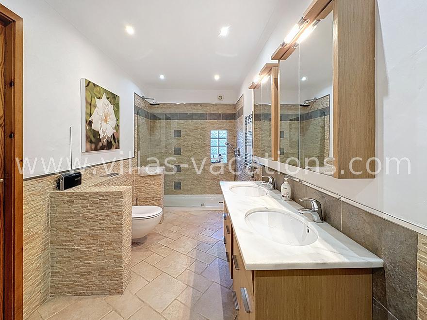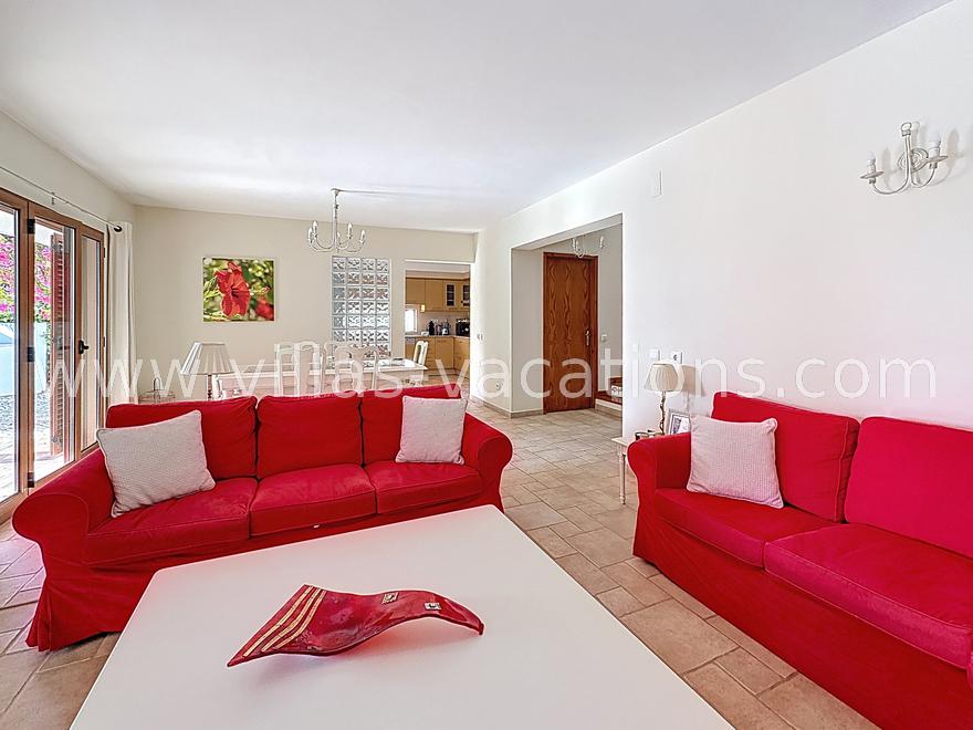 Off the entrance hall is a very tastefully decorated and spacious lounge with a flatscreen TV and Sonos music centre, a wood burning fireplace and patio doors to the large covered terrace, pool and gardens. The dining area can seat between 6 and 8 people, also with patio doors leading outside.